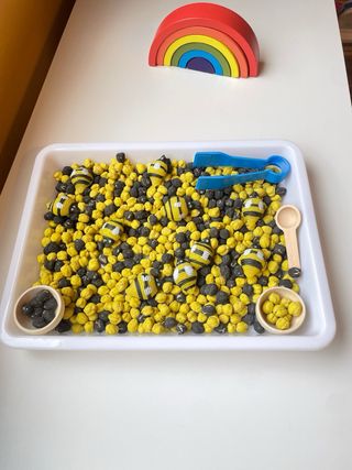 Propuesta Montessori para trabajar la motricidad fina, la coordinación ojo–mano y la estimulación sensorial, mientras los peques descubren el fascinante mundo de las abejas. La bandeja tiene como base garbanzos amarillos y negros que representan el polen. Se incluyen dos cuencos para que el niño ayude a las abejas a clasificar el polen por colores, convirtiendo la actividad en un pequeño reto de lógica y observación. Incluye también herramientas de trasvase como pinzas y una cucharilla, que invitan a recoger, mover y clasificar con precisión. Ideal para favorecer la concentración, la autonomía y el juego libre. Perfecta para acti