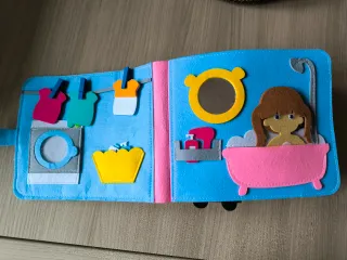 Libro sensorial de fieltro diseñado para el aprendizaje temprano y la estimulación de niños pequeños. Material: Confeccionado principalmente en fieltro suave y resistente. Funcionalidad: Incluye actividades interactivas para desarrollar habilidades motoras finas y reconocimiento de colores o formas. Diseño: Temáticas muy variadas cómo veis en las fotos. Hay alguna hoja sin fotografías pero está en el mismo buen estado que las otras. Edad recomendada: niños pequeños, aproximadamente de 9 meses a 6 años.