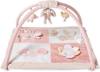 Parque de actividades y gimnasio para bebés, ideal para el desarrollo del tummy time y la estimulación temprana. Incluye varios juguetes colgantes y texturas. - Arcos ajustables. - Juguetes con sonajero y texturas. - Espejo de seguridad. - Colchoneta suave y lavable.