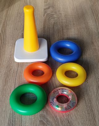 Clásica pirámide de aros de Fisher-Price para apilar. Ideal para el desarrollo de la motricidad fina. - Base blanca. - Aros de colores: rojo, naranja, amarillo, verde y azul. - Incluye un sonajero en la parte superior.