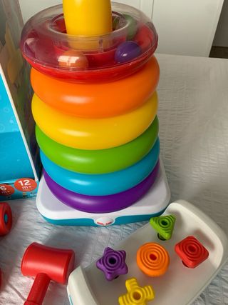 Trio de juguetes de Fisher Price, con torre de aros tamaño XL, bloques y banco con martillo. Todo en su caja original, en buen estado. Nuevo cuesta más de 70€.