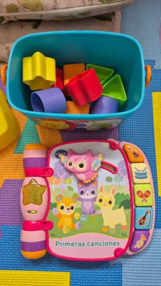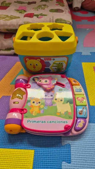 Set de juego Fisher Price que incluye un cubo rompecabezas con figuras y un libro musical. - Cubo de plástico con asas laterales. - Figuras de colores para encajar en el cubo. - Libro interactivo con animales y botones. - Título del libro: Primeras canciones. Como nuevo