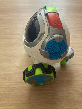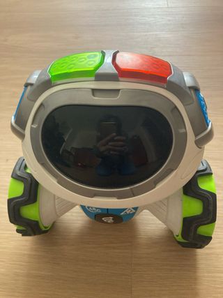 Robot infantil que ilumina su barriga con LED de colores. 3 opciones de juego: A bailar!, Aprendizaje y juegos y Graba y remezcla. Progresivamente, se va adaptando al desarrollo del niño. Funciones: karaoke 40 canciones, letras, números, colores, relaciones causa-efecto, mejora motricidad fina y gruesa. Permite grabar una frase e incorporarla a los temas musicales que reproduce. A partir de 9 meses. Funciona con 4 AA (no incluidas)