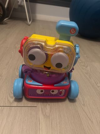 Este robot de Fisher-Price es un juguete educativo y divertido. - Colores vibrantes: amarillo, morado, rojo y azul. - Diseño con ruedas para movimiento. - Detalles de engranajes y ojos grandes. - Incluye el logo 'fp' en la parte superior.