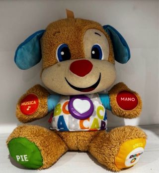 Este peluche interactivo es un perrito parlanchín. - Tiene botones en las patas y en el pecho. - Incluye texto en español: Música, Mano, Pie, Apreta. - El diseño del pecho muestra letras y un corazón.
