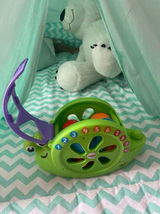 Juego de psicomotricidad Fisher Price con forma de caracol. - Diseño de caracol en color verde. - Caparazón con números del 1 al 10. - Ruedas y elementos interactivos para el bebé.