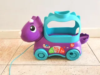Divertido dinosaurio de Fisher Price con varias pelotas de colores. - Diseño de dinosaurio morado y azul. - Incluye pelotas de varios colores: rojo, azul, verde y amarillo. - Ruedas para arrastrarlo. - Detalles de luces y botones en la parte frontal. - Tiene 2 idiomas, español e inglés para aumentar el aprendizaje. Tengo más juguetes en mi perfil.