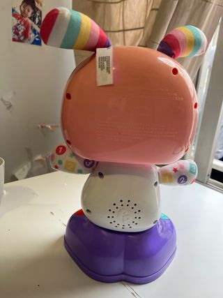 Este peluche interactivo de Fisher-Price es un compañero de juegos perfecto. Suave y colorido, está diseñado para estimular el aprendizaje. Nuevo cuesta 28€. - Orejas con texto OREJA. - Pata izquierda con texto MÚSICA y nota musical. - Pata derecha con texto MANO. - Panza con letras del abecedario y un corazón. - Pie izquierdo con texto PIE. - Pie derecho con texto APRETAR y números.