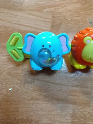 Vendo lote de juguetes para bebés de la marca Fisher-Price. Son juguetes coloridos y en buen estado. - Incluye: Dos sonajeros, (tentempié de osito amarillo y cadena de animales que se puede poner en la silla de paseo) Dos peluches (sol y vaca) con música tirando de la cuerda 1 juego de agua (pingüino) qué desconozco si funciona. - Perfectos para estimular los sentidos del bebé. LOTE COMPLETO 15€