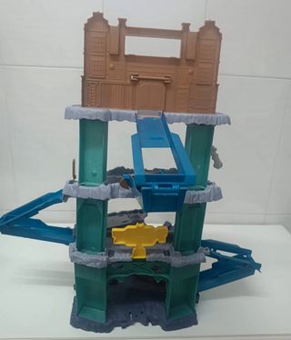 Circuito Batman hotwheels Fisher Price en forma de torre donde se van pasado de una planta a otra los coches mediante pasarelas. También tiene un ascensor en la panta de abajo con el símbolo de Batman en amarillo y disparadores de coche en la parte de abajo. En perfecto estado Quitando las rampas se baja toda las plantas reduciendo su tamaño a la hora de almacenaje Medidas Abierto 51cm altox24x20 Cerrado 34cm altox24x20