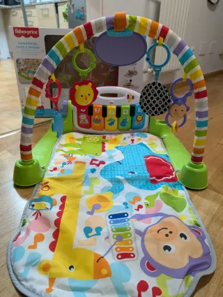 Manta de actividades para bebés de la marca Fisher-Price, con un diseño colorido y divertido. - Incluye arco de juegos con varios colgantes. - Piano musical integrado en la manta. - Ilustraciones de animales y notas musicales.