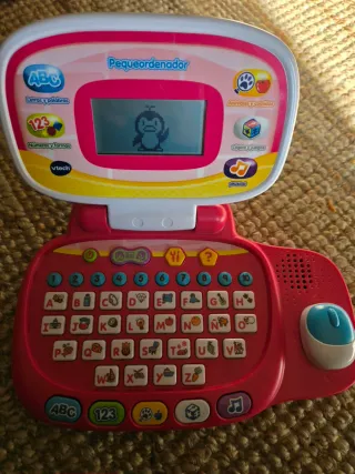 Ordenador educativo de juguete Vtech en color rosa, diseñado para niños. - Pantalla con juegos interactivos. - Teclado con letras y números. - Botones de acceso rápido a diferentes funciones como música, formas, lógica, letras, números, animales, comidas y palabras. - Altavoces integrados.