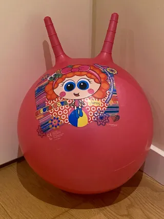 Pelota saltarina de color rosa con un divertido diseño Rebota-bota - Dos asas para sujetar. - Ilustración de personaje infantil, Chamoy. - A partir de 3 años - 45-50cm