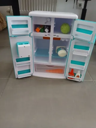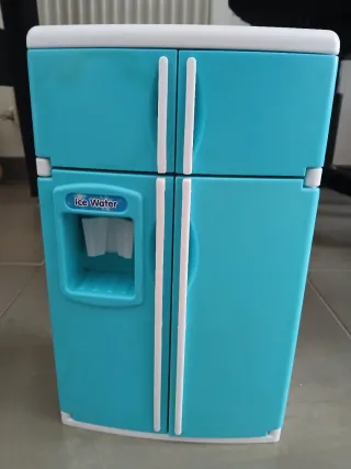 Nevera de juguete de color azul, ideal para juegos infantiles. - Diseño de dos puertas. - Incluye dispensador de agua y hielo. Funciona con pilas.