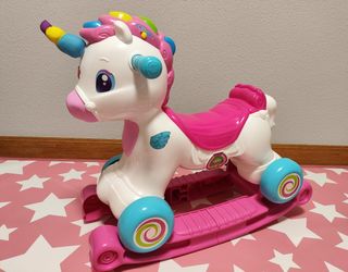 Unicornio de la marca Clementoni. 3 modalidades de juego: se balancea, se puede pasear con él y además es un centro de actividades educativas con voz y sonidos Enseña a los más pequeños las letras, los números, nombres de animales… El detector del hocico, sabrá cuándo le están acariciando Con sensor del movimiento, detectará la modalidad de juego Con canciones y melodías infantiles Se puede jugar en Inglés y Español De 12 a 36 meses Muy poco uso, no tiene arañazos. Alguna punta de pegatina ligeramente despegada.