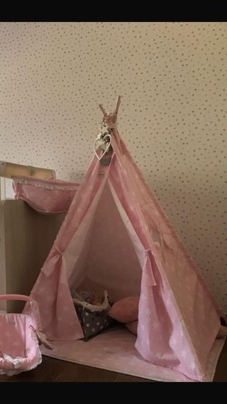 Tienda de campaña tipo tipi para jugar, ideal para habitaciones infantiles. Su diseño es divertido y llamativo. - Color rosa con estampado de estrellas blancas.