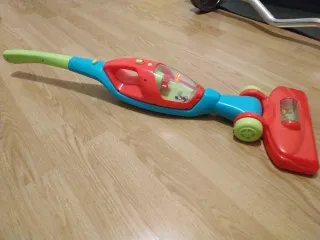 Divertido aspirador de juguete con colores vivos. - Mango extensible. - Compartimento transparente con bolitas. - Ruedas verdes.
