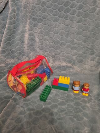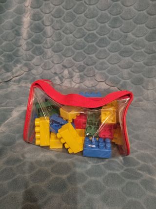 Bloques de construcción y dos muñecos en bolsa transparente.
