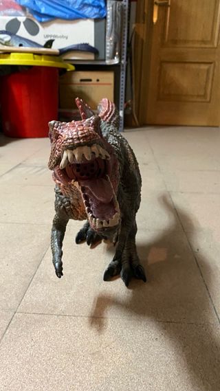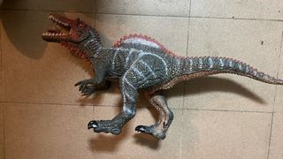En perfecto estado. Spinosaurus. El modelo tiene una textura detallada, con escamas prominentes y una coloración que combina tonos verdes y marrones, junto con un rojo intenso en la parte superior del cuerpo, especialmente en la cabeza y la vela dorsal.
