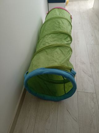 Tubo de juego plegable de la marca Ikea, ideal para que los niños se diviertan. - Color verde con detalles en azul y rosa. - Material de tela resistente.