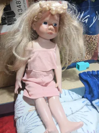 Muñeca de aspecto infantil con cabello rubio y vestido de dos piezas en color rosa. - Vestido de tirantes. - Falda a juego.