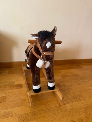 Caballo balancín de peluche para niños. - Color marrón con detalles blancos y negros. - Asiento con riendas y estribos. - Base de madera para balanceo.