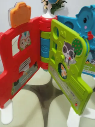 Juguete musical interactivo para niños pequeños. Presenta un diseño colorido y atractivo con diferentes actividades. - Tambor central con luces. - Engranajes giratorios. - Panel con letras y números. - Figura de animal con imagen giratoria.
