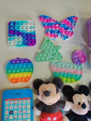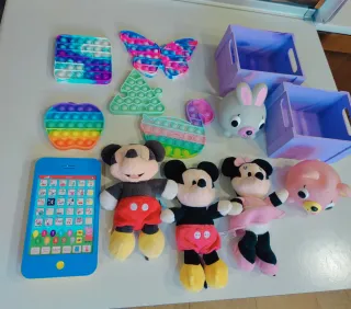 Lote variado de juguetes infantiles. - Peluches de Mickey Mouse, Minnie Mouse, un conejo y un cerdito. - Varios juguetes tipo 'pop it' con diferentes formas (cuadrado, mariposa, árbol, manzana, oreja). - Una tablet interactiva papá pig.funciona perfectamente. - Dos cajas de almacenaje de color lila.