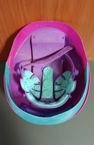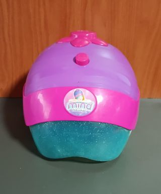 Juguete casco masajeador infantil Mind Massage de IMC Toys Ofrece 5 tipos de masajes vibratorios diferentes diseñados para la relajación. Incluye música relajante que acompaña a cada masaje. Está ambientado en lugares exóticos como playas hawaianas o la selva amazónica - Parte superior morada y rosa. - Base con purpurina turquesa. - Adhesivo con el logo 'mind massage'.