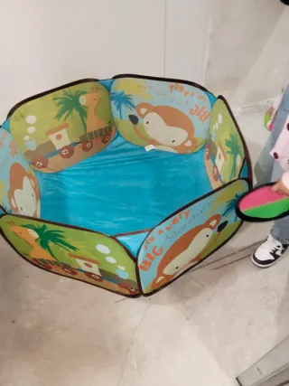 Divertido parque de bolas para niños con un diseño de animales y temática de aventura. - Diseño con jirafas, monos y zorros. - Estampado de tren y palmeras. - Colores vivos y alegres.