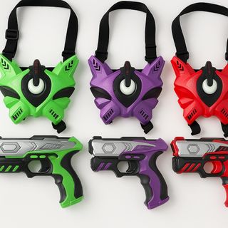 Juego de 3 pistolas láser para niños, ideales para juegos de acción. Las pistolas son de colores llamativos y parecen estar en buen estado. - Incluye 3 pistolas láser con sus respectivos sensores. - Colores: verde, morado y rojo. - Diseño futurista. Tiene 4 modos de disparo, el primer disparo quita menos vida pero puedes lanzar más sin recargarse, sin embargo el último quita mucha vida pero solo puedes disparar una vez.