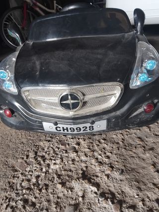 Coche de juguete eléctrico para niños, en color negro. Está en buen estado, aunque presenta algunos signos de uso. - Modelo similar a Mercedes Benz. - Con placa CH9928. Con radio fm incorporada pitido Lo único hay que coger un cargador nuevo Se puede usar manual o com control parental para el pala conducirlo con el mando Recogerlo en mano en el barco de valdeorras mejor y sino intento enviarlo