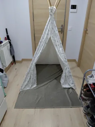 Tienda tipi de tela con estampado infantil, ideal para juegos. - Estructura de madera. - Tela con estampado de figuras. - Alfombra de suelo incluida. 110cm de base 150cm altura de la cabaña 170cm altura total palos