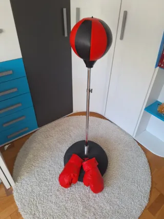 Pera de boxeo infantil con guantes incluidos. Ideal para que los más pequeños se inicien en el deporte. - Pera de boxeo de color rojo y negro. - Base estable para mayor seguridad. - Incluye un par de guantes de boxeo rojos.