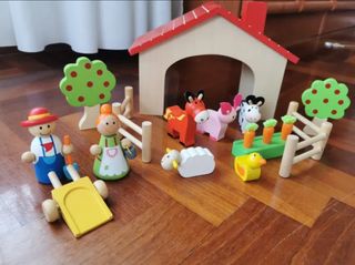 Preciosa granja de madera para niños, ideal para juego libre y simbólico. Incluye gran variedad de figuras de animales y personas. - Granja de madera con tejado rojo. - 2 figuras de granjeros. - Caballo, cerdo, vaca y oveja de madera. - Patito de madera. - Árbol de madera con manzanas. - Vallas de madera. - Zanahorias de madera.