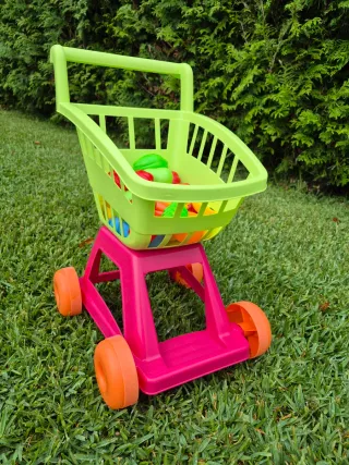 Carrito de la compra de juguete, ideal para que los más pequeños jueguen a hacer la compra. Su diseño colorido y resistente lo hace perfecto para horas de diversión. - Carrito de plástico resistente. - Color verde y rosa. - Ruedas naranjas.
