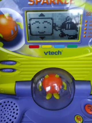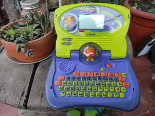 Ordenador educativo VTech Sparkle en color verde y morado. Diseñado para el aprendizaje interactivo. Está perfecto, funciona a pilas y le duran mucho. - Pantalla con SPARKLE y 22 actividades. - Teclado QWERTY con letras y números. - Figura de personaje en la parte superior que se mueve mientras juegas. - Botones de control y menú.
