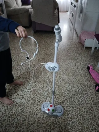 Micrófono de karaoke para niños de la marca Juguettos. Ideal para horas de diversión cantando. - Base con luces y altavoces. - Soporte ajustable en altura. - Incluye auriculares con micrófono.