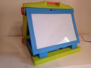 Pizarra con lado para pintar con tiza y otro lado para rotuladores vileda. Hay que limpiarla. Estado aceptable, ha perdido algún tornillo de sujeción y se han colocado unas bridas. Se levanta la bandeja y se pega. Hay que venir a recoger , no envío. Sólo 5€