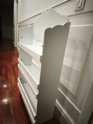 Estantería de estilo Montessori, perfecta para organizar libros y juguetes. - Diseño de nube en la parte superior. - Estructura de madera blanca. - Tres niveles de estantes. - Patas de madera claras. Se le rompió una tabla, que tenemos, del estante superior, y que se puede reparar.