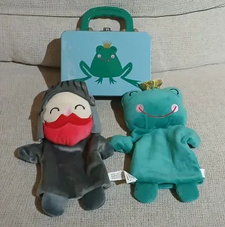 Set de maletín infantil con dos marionetas, una de un caballero con armadura y la otra de una princesa con corona transformada en ranita. Maletín metálico azul con asa verde de plástico y diseño de la princesa ranita. Están impecables, prácticamente nada de uso, no necesitan ni lavar.