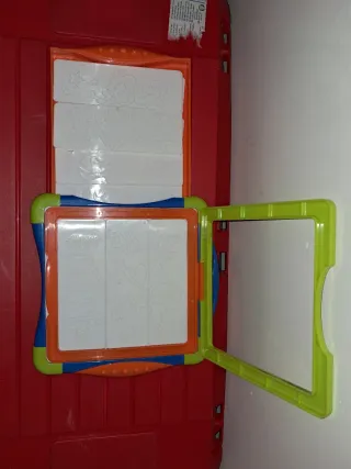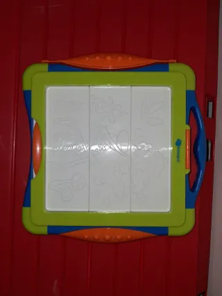 Tablero de dibujo con placas de relieve para crear diseños. - Marco de plástico de colores: verde, azul y naranja. - Superficie de dibujo blanca dividida en tres secciones.