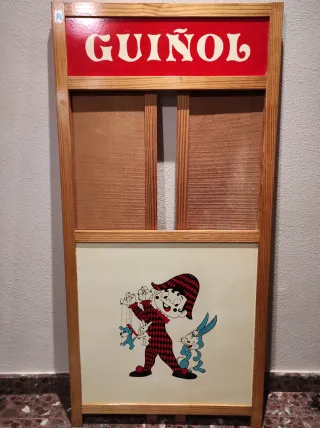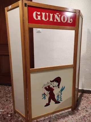 Teatro de guiñol con diseño infantil. - Marco de madera. - Panel frontal ilustrado con personajes. - Parte superior con el texto GUIÑOL en rojo y blanco. - Medidas: Alto 125cm x Ancho ( desplegado ) 116cm. x Fondo 1,5 cm.