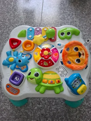 Mesita de Actividades Sensoriales de VTech en excelente estado. Juguete súper completo que combina música, luces y texturas para estimular los sentidos de tu bebé. Lo mejor de esta mesa: Multisensorial: Incluye un león de tela suave, xilófono musical, piezas para encajar y botones con números y formas. Evolutiva: Las patas se pueden quitar para jugar en el suelo o ponerlas cuando el bebé empiece a ponerse de pie. Interactiva: Panel central con luces, canciones y frases en español que enseñan colores y animales. Extra: Incluye un pequeño teléfono/walkie-talkie extraíble. Estado: Impecable, limpia y funcionando perfectamente.