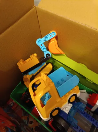 Caja de piezas Lego infantiles. Incluye un camión y excavadora. También el coche y torre de control de Chase ( Patrulla Canina)