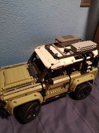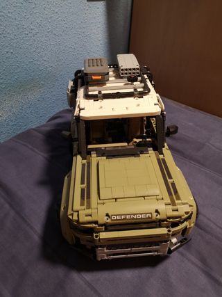 Réplica detallada de un coche todoterreno construida con piezas de Lego Technic. - Color principal: verde oliva. - Incluye accesorios en el techo y laterales. - Ruedas negras con llantas detalladas.