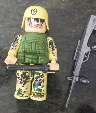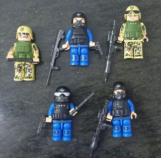 Pack de figuras tipo Lego de policías y soldados. - Figuras algo grandes. - Incluye accesorios como armas y chalecos.