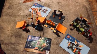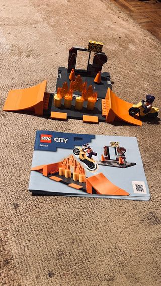 Set de Lego City con temática de acrobacias. - Incluye rampas y obstáculos. - Varios vehículos de motor. - Accesorios de fuego y decoración. No dispone de las cajas originales, y va ir desmontado