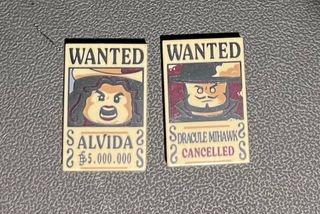 Lego One Piece. Cambiamos los carteles de Lego de Se busca Wanted Tenemos - Dracule Mihawk - Kuro - Alvida Cambiamos uno de ellos por: - Buggy Preferiblemente en mano