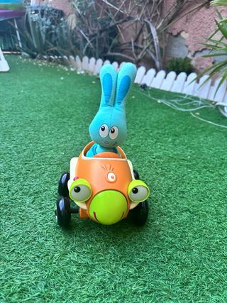 Divertido coche musical con un simpático conejito Quaps. - El coche tiene luces. - El conejito es de peluche azul. - música diferente - Cuando el coche se estrella, el conejo salta fuera Mira otros juguetes en mi perfil